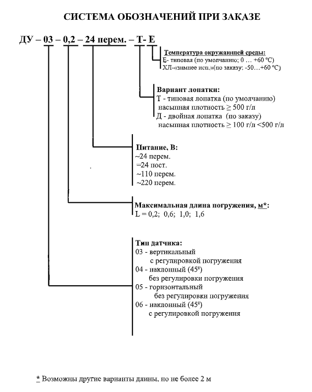 Длина погружение выбирается из ряда L=0,2; 0,6; 1,0; 1,6 (м); или по заказу, но не более 2 метров.